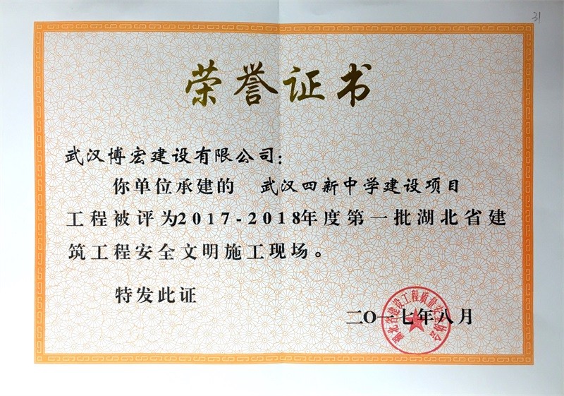 結(jié)構(gòu)優(yōu)質(zhì)工程證書(武漢四新中學綜合教學樓1-4號樓)