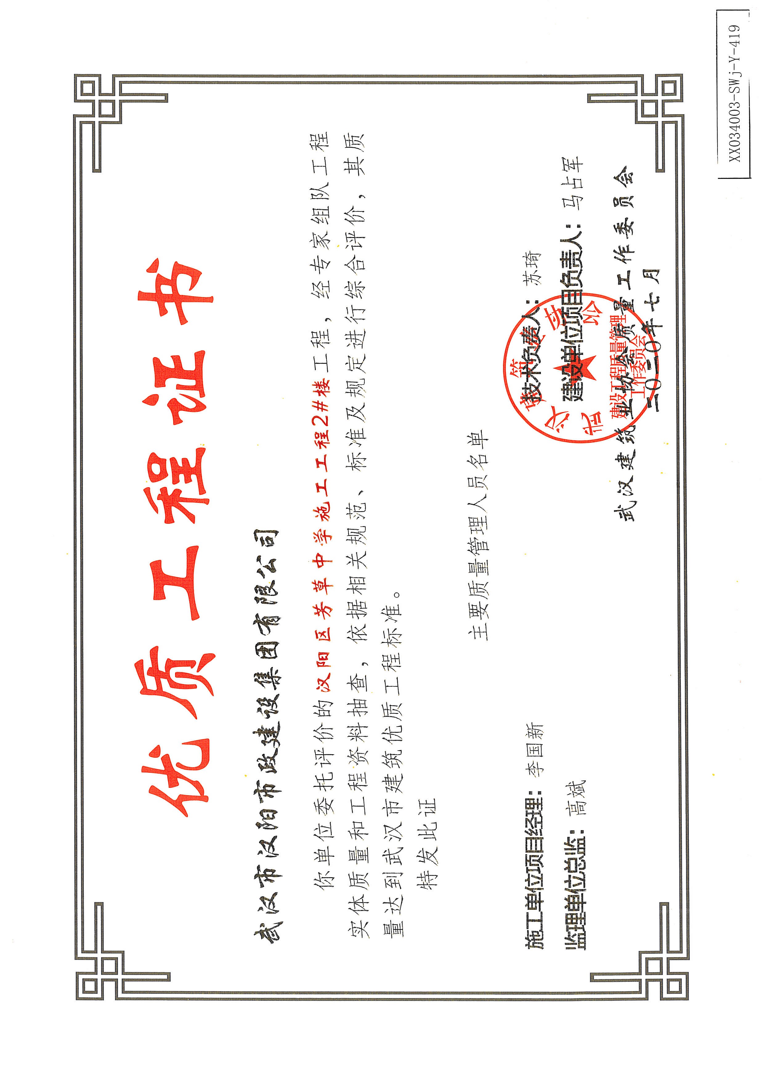 優(yōu)質(zhì)工程證書(shū)(武漢四新中學(xué)建設(shè)項(xiàng)目工程(綜合教學(xué)1--4號(hào)樓)
