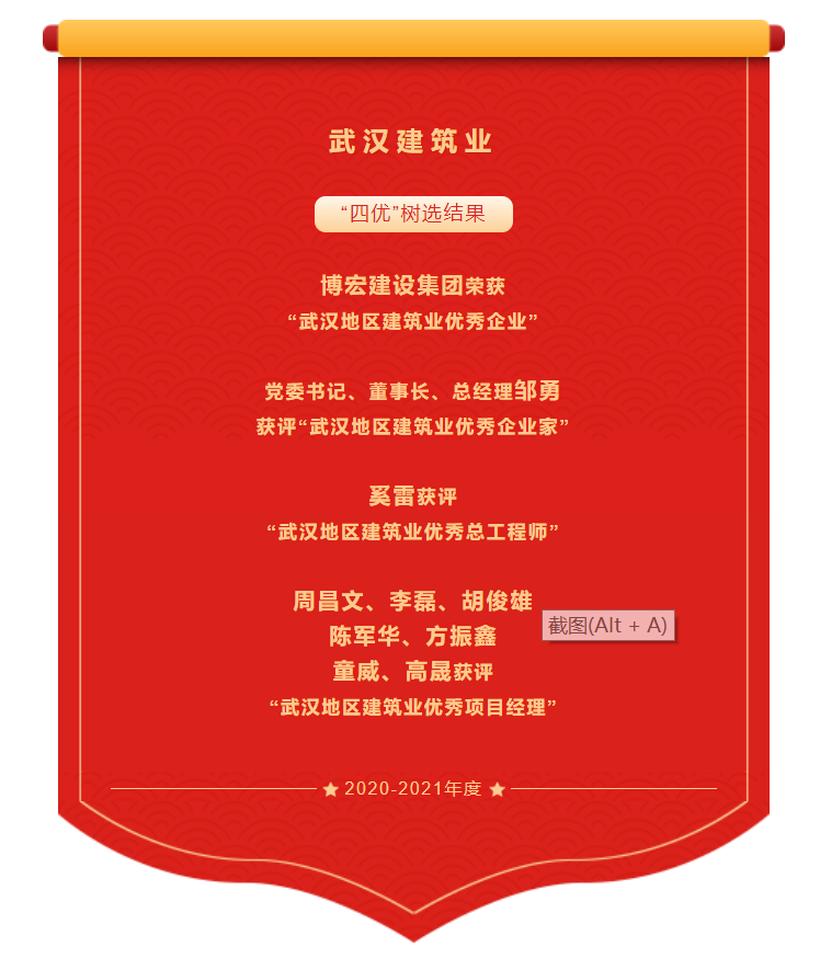 ? ? ? ? 近日,武漢建筑業(yè)協(xié)會發(fā)布2020-2021年度武漢地區(qū)建筑業(yè)優(yōu)秀企業(yè)、優(yōu)秀企業(yè)家、優(yōu)秀總工程師、優(yōu)秀項目經(jīng)理(以下稱為“四優(yōu)”)選樹結(jié)果。經(jīng)會員單位自主申報、協(xié)會組織專家評審、主管部門復核、武漢建協(xié)三季度會長辦公會審議通過并在協(xié)會網(wǎng)站進行公示,“四優(yōu)”選樹結(jié)果名單火熱出爐。博宏建設集團榮獲“武漢地區(qū)建筑業(yè)優(yōu)秀企業(yè)”;黨委書記、董事長、總經(jīng)理鄒勇獲評“武漢地區(qū)建筑業(yè)優(yōu)秀企業(yè)家”;奚雷獲評“武漢地區(qū)建筑業(yè)優(yōu)秀總工程師”;周昌文、李磊、胡俊雄、陳軍華、方振鑫、童威及高晟獲評“武漢地區(qū)建筑業(yè)優(yōu)秀項目經(jīng)理”。