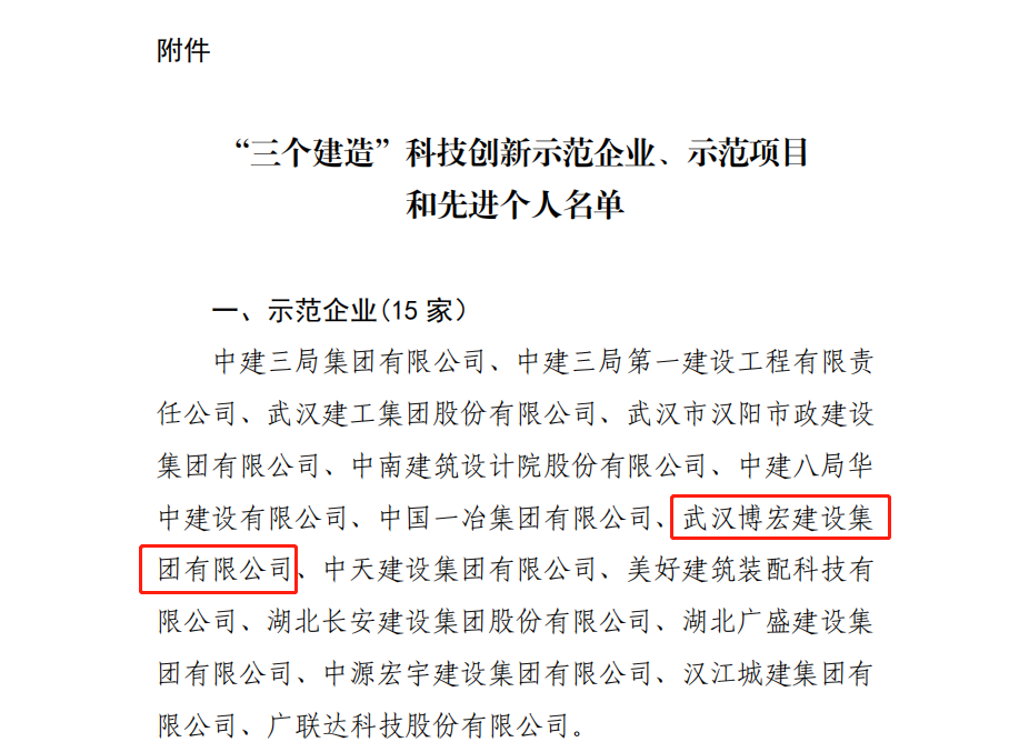 12月28日湖北省住房和城鄉(xiāng)建設(shè)廳發(fā)布關(guān)于綠色建造智能建造品質(zhì)建造科技創(chuàng)新工作情況的通報,博宏建設(shè)集團(tuán)入選“三個建造”科技創(chuàng)新示范企業(yè);漢陽市政建設(shè)大廈(一標(biāo)段)、新建商務(wù)服務(wù)與設(shè)施項目(中南科研設(shè)計中心)項目入選“三個建造”科技創(chuàng)新示范項目;嚴(yán)俊、楊云華入選“三個建造”科技創(chuàng)新先進(jìn)個人。